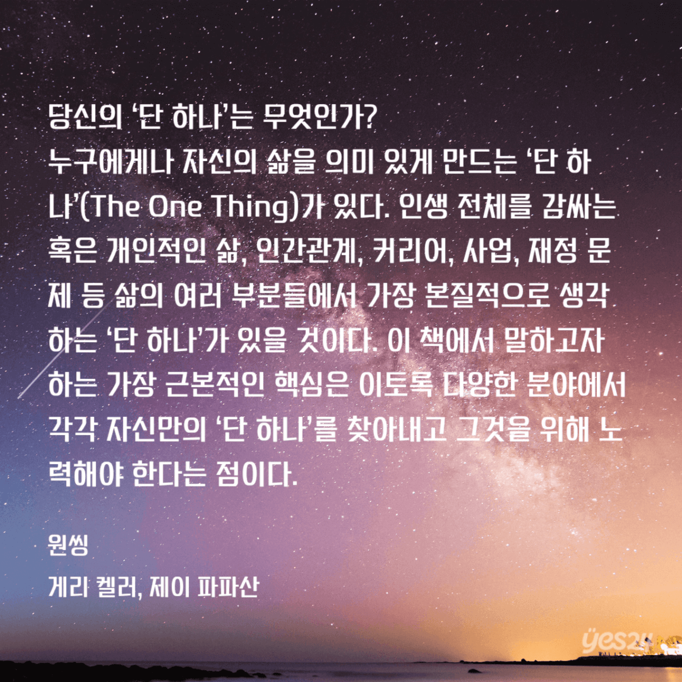 무언가를 향한 열정은 곧 어마어마한 양의 연습이나 노력으로 이어진다. 그렇게 쓰인 시간은 기술로 축적되고, 기술이 나아지면 결과 역시 나아진다. 더 나은 결과는 보통 더 많은 즐거움을 불러오고, 그러면 다시 더 많은 열정과 시간이 투자된다. 탁월한 성과로 나아가는 선순환이 이루어지는 것이다. 어떻게 해야 최고의 결정을 내리고, 후회하지 않는 삶을 살 수 있을까? 단 하나의 원칙을 따라 살면 된다. 성공한 사람들은 그 사실을 이미 알고 있었다. 성공의 핵심에는 ‘단 하나’가 자리 잡고 있다. 바로 그 단 하나가 탁월한 성과를 이끌어 내는 시작점이다.