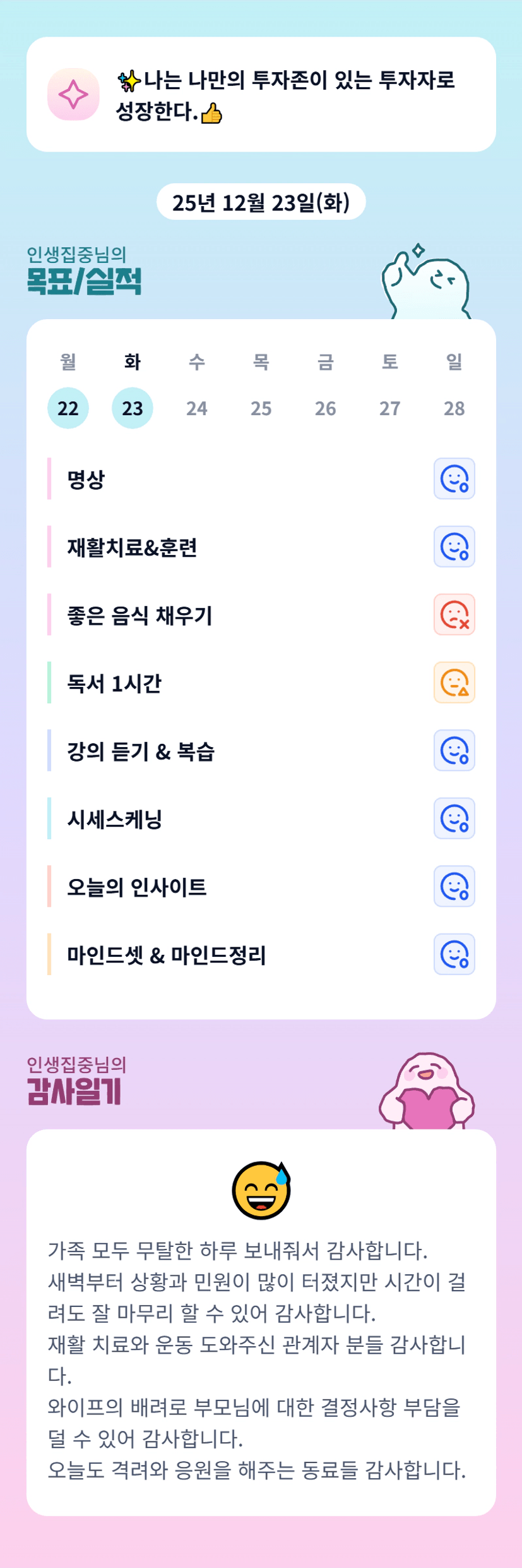 집중님:) 오늘 하루도 고생많으셨어요!!! 저도 집중님의 응원과 격려 항상 감사합니다!!!