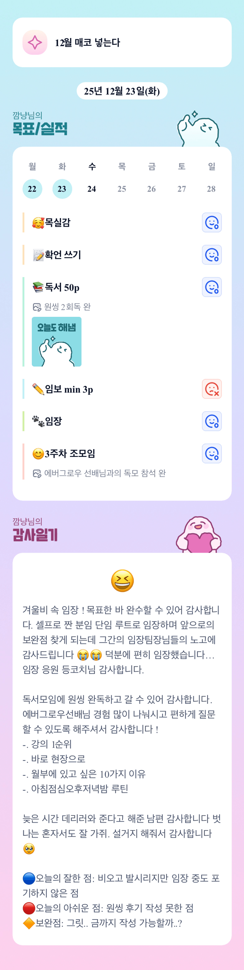 알콩달콩이 담긴 목실감이네요.12월 매코 원씽 응원합니다.