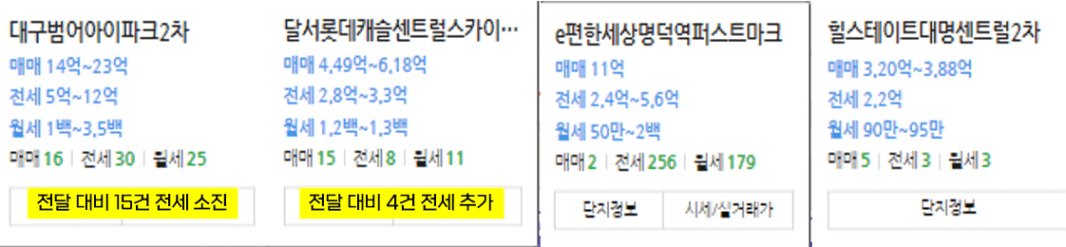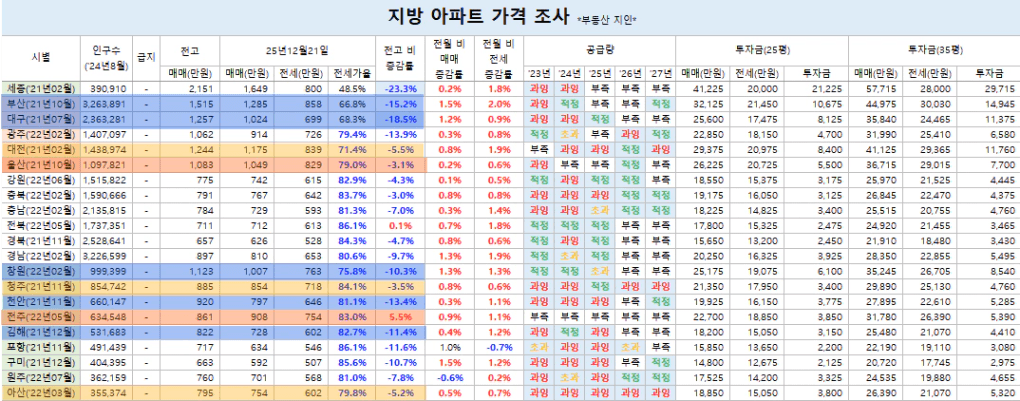 특히 광역시 급 부산과 대구가 절대적으로 저렴하며, 부산,,, 상당히 빠르게 움직이고 있다.
