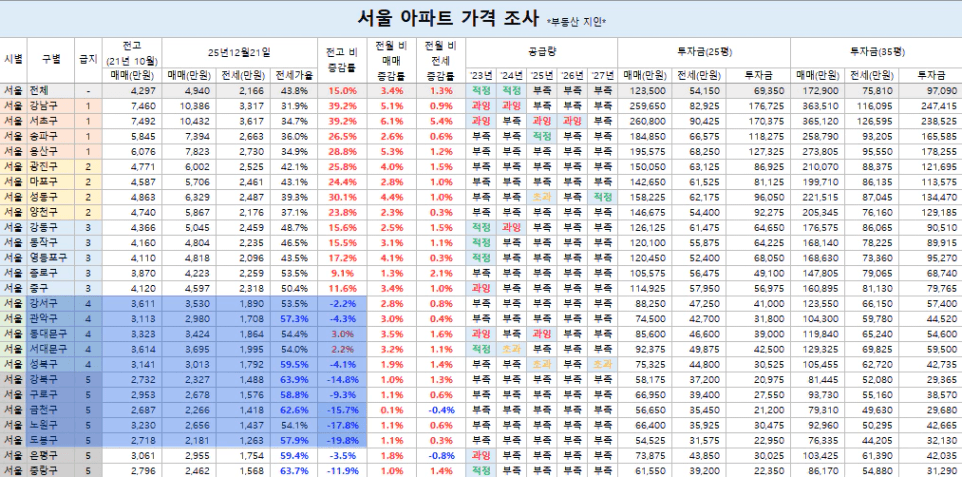 상급지의 경우 30% 수준의 전세가율을 보여주고, 4급지~5급지는 지역 평균 전세가 50 중 후반 ~ 60% 수준