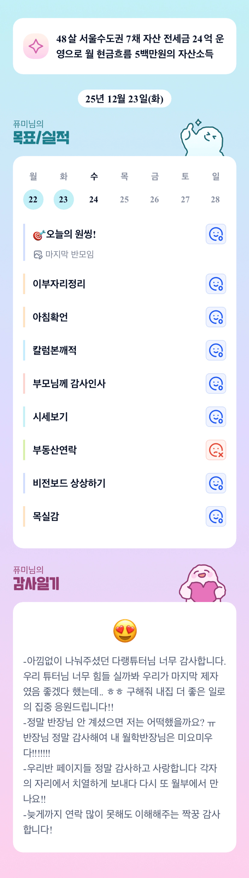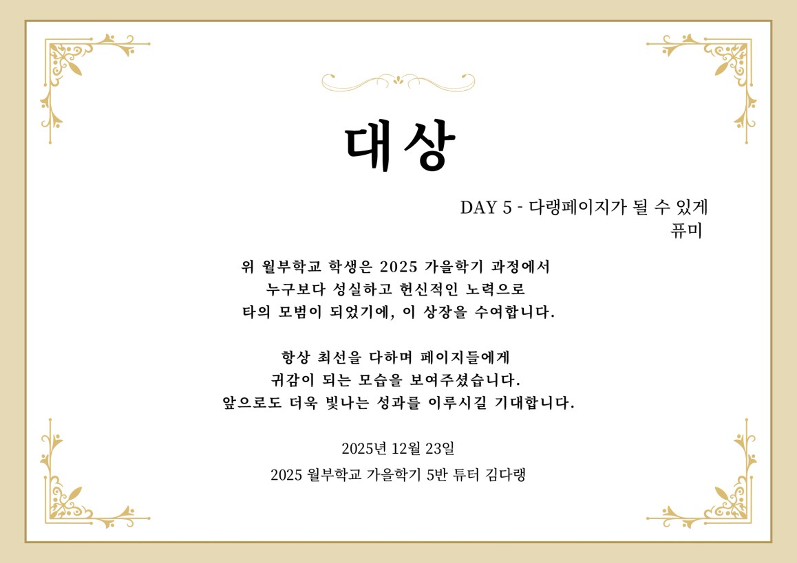 와우 대상 수상자 퓨미님 멋지다~!!! 가을 학기 3개월 너무 수고 하셨습니다. 25년 마무리 잘 하시고 26년도 화이팅 입니다. 퓨미님 메리 크리스마스~ 🎄🎉
