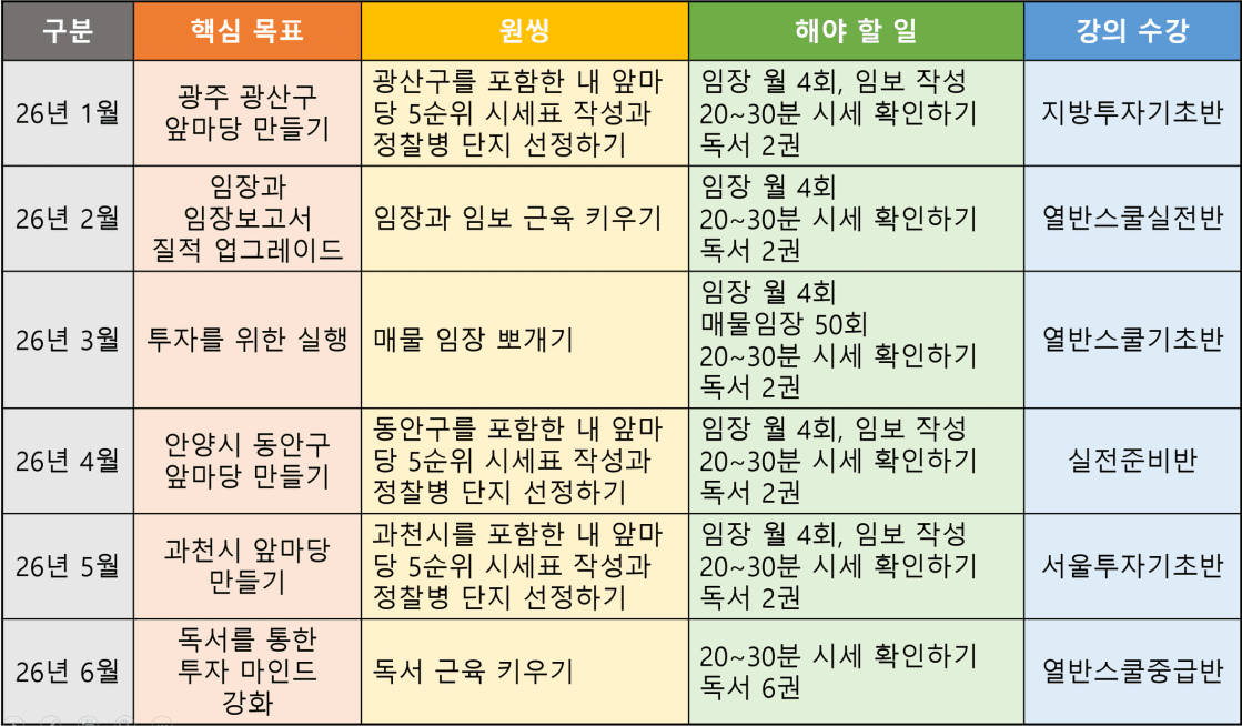 전체적으로 저의 6개월 계획은 매달 하나의 원씽을 중심에 두고, 임장과 시세 확인, 독서라는 기본 루틴을 흔들림 없이 유지하면서 강의 수강을 통해 이론과 실전의 균형을 차근차근 키워 나가는 것을 목표로 하고 있습니다.
