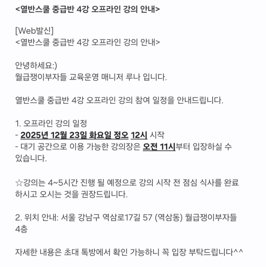또한 강의장에 들어서는 순간부터 따뜻한 미소로 맞아주시고, 안내와 쾌적한 환경을 세심하게 챙겨주신 루나님께도 감사드립니다. 강의에 온전히 집중할 수 있도록 보이지 않는 곳에서 애써주신 배려가 고스란히 느껴졌습니다.