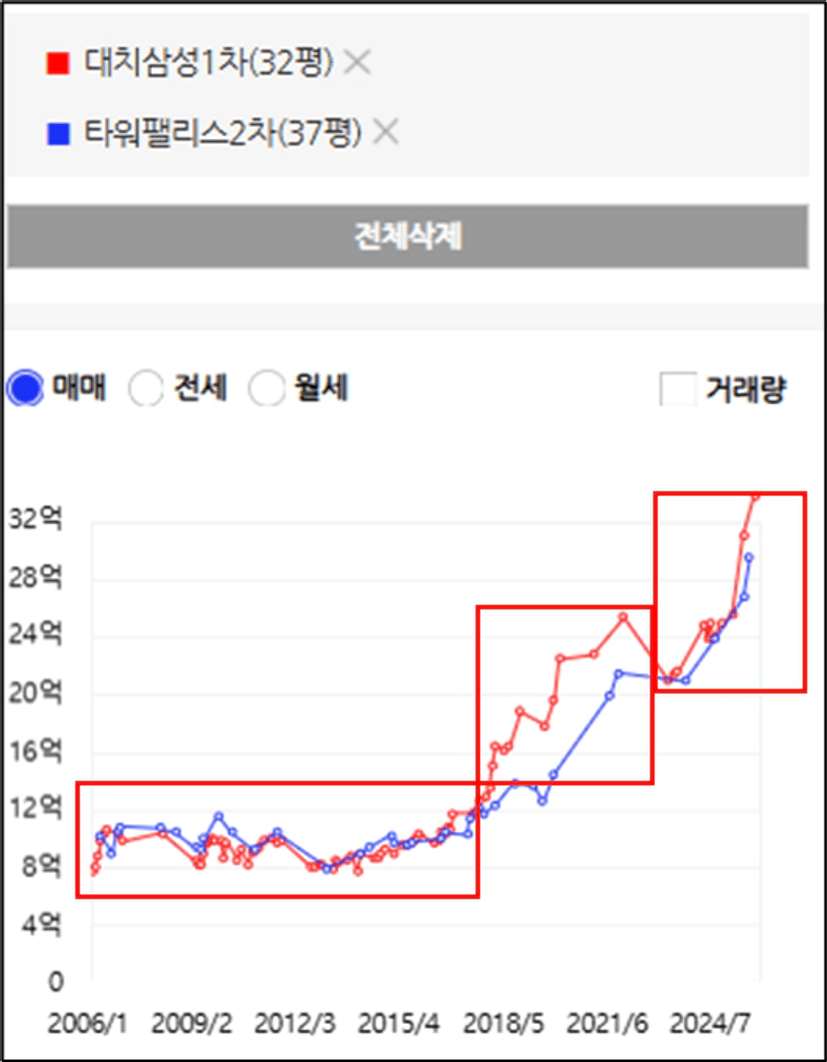 아파트인 대치삼성1차가 비슷한 흐름을 보이다가