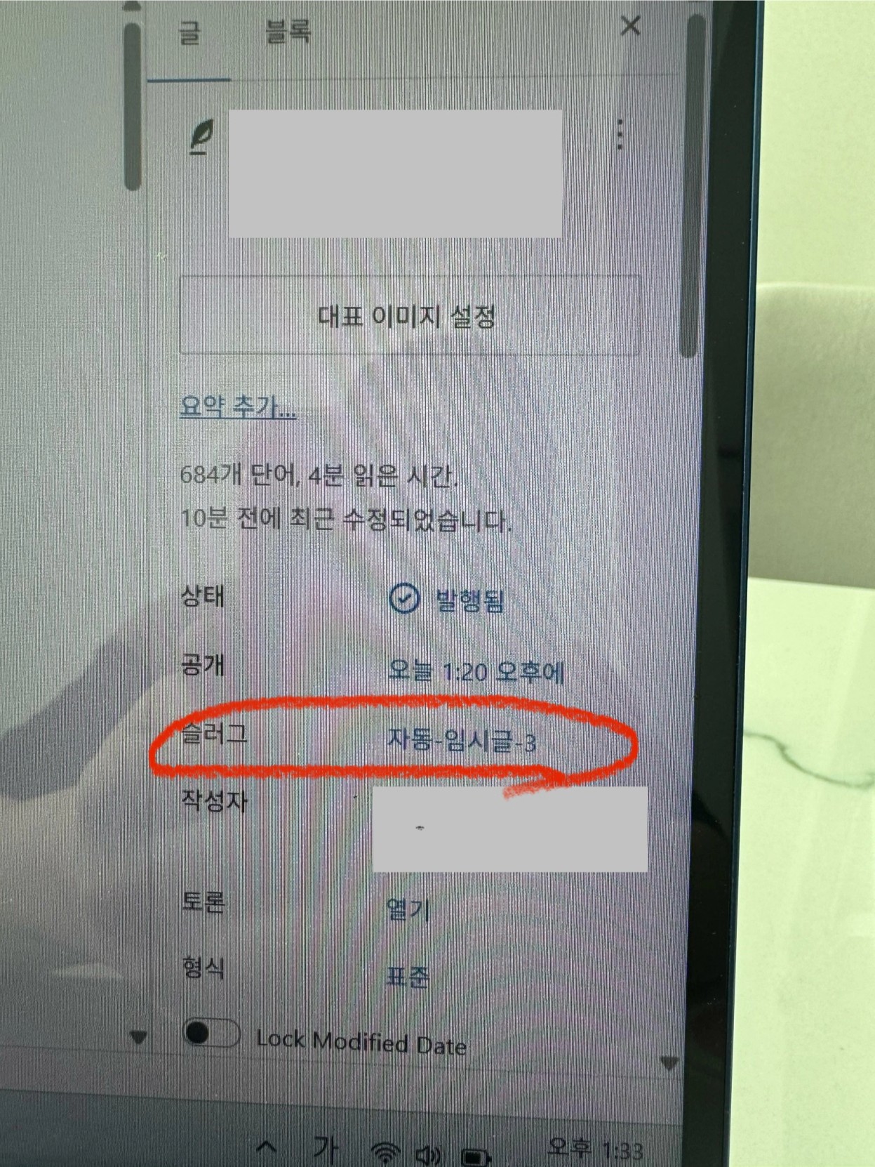 카테고리를 만들 때 이름, 슬러그, 설명 부분도 다 채워 넣었는데, 글 오른쪽 슬러그에 보면 거기에도   ‘자동-임시글-3’ 이라고 나와 있구요.