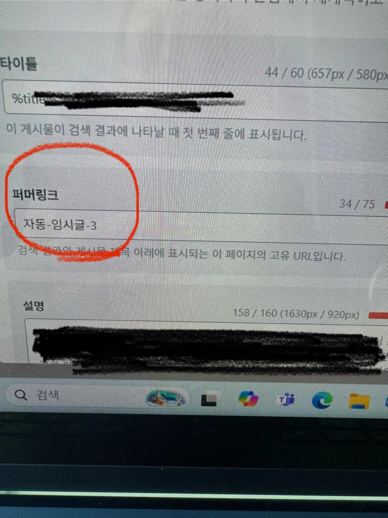 rank math - 스니펫 편집 - 퍼머링크  여기를 보면 내용이 들어가 있지 않고 ‘자동-임시글-3’이렇게 쓰여 있어요.