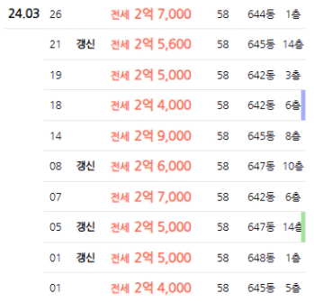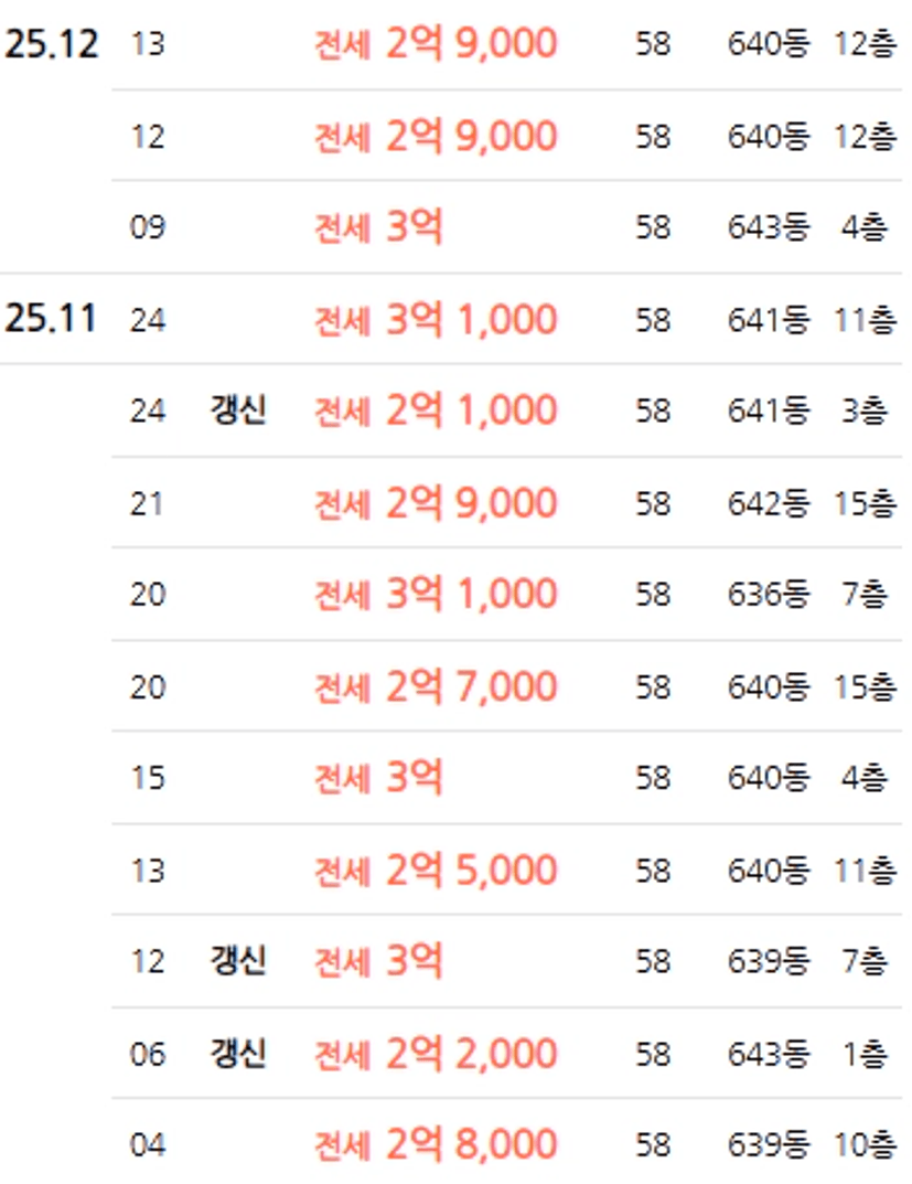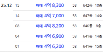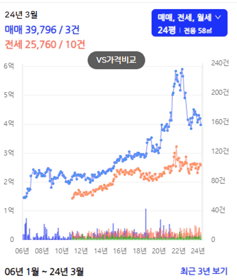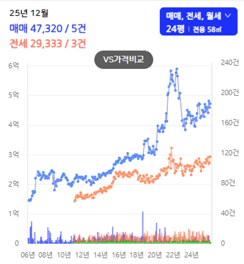 바로 위는 현재 동일한 아파트의 거래 가격입니다. 전세는 큰 상승이 없어 보이지만 매매 가격이 적어도 6천만원은 차이나는걸 보실 수 있겠죠?