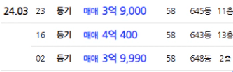제가 월부에 23년 9월 열기를 첫 수강으로 시작했다고 했죠? 그로 부터 그 당시 제가 가진 투자금으로 투자가 가능했던 경기도 아파트 단지의 24년 3월 거래 가격입니다. 6개월이 지난 시점 저는 부족하다고 생각하여 투자를 미뤄 왔어요.