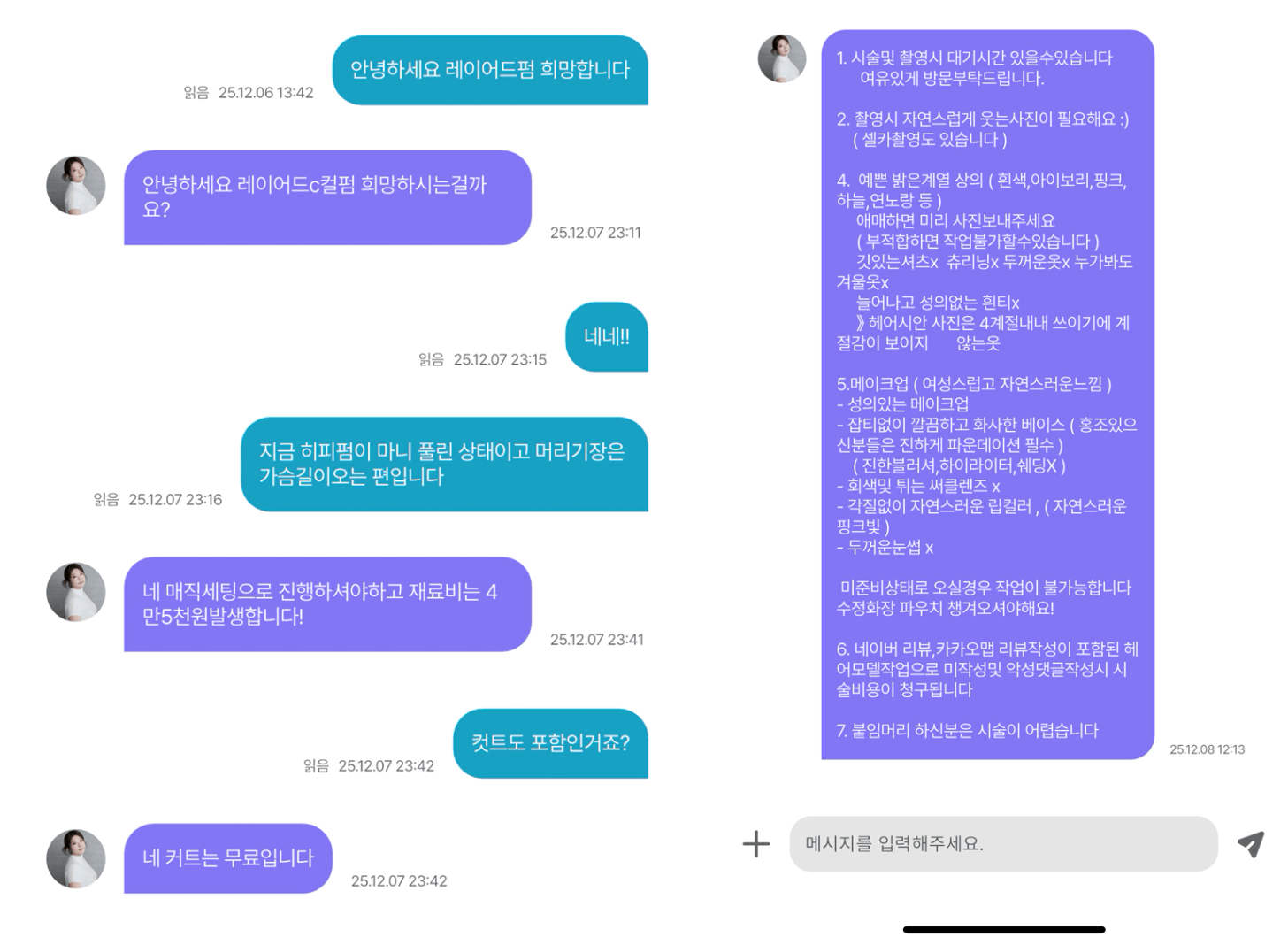 사진 촬영을 위해 메이크업이나 의상을 요청하시는 경우도 있으니