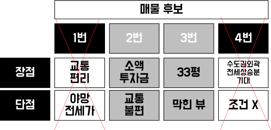 1번 물건은 교통이 좋은 편인데 절대가가 높은 반면 투자금이 적게드는 곳이었고