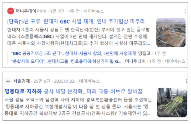 • GBC & 영동대로 지하화: 2026년부터 약 4.6조 원의 투자가 본격화되며 삼성역 일대가 국제 업무의 중심지로 변화합니다. 이미 GTX-A 노선이 개통이 되었음에도 큰 영향을 주지 못하는 가장 큰 이유는 삼성역까지의 개통에 대한 지연인데 개통까지 한발 더 나아가게 될 것입니다.