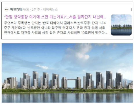 • 반포 디에이치 클래스트 : 5,000가구 규모의 랜드마크로 2027~28년 입주를 목표 공사가 진행중에 있습니다. 분양가 상한제 속에서도 평당 7,000만 원 이상의 분양가가 예상됩니다.