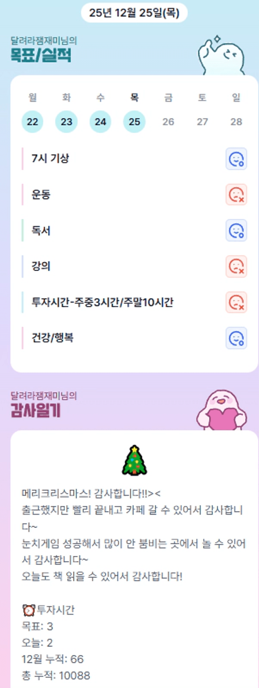 잼재미님~ 오늘 하루도 넘 고생 많으셨습니다!!!! 오늘 출근도 하셨는데 그래도 칼퇴해서 다행이에욥!! 남은 시간 즐거운 크리스마스 보내세요~ 🎄