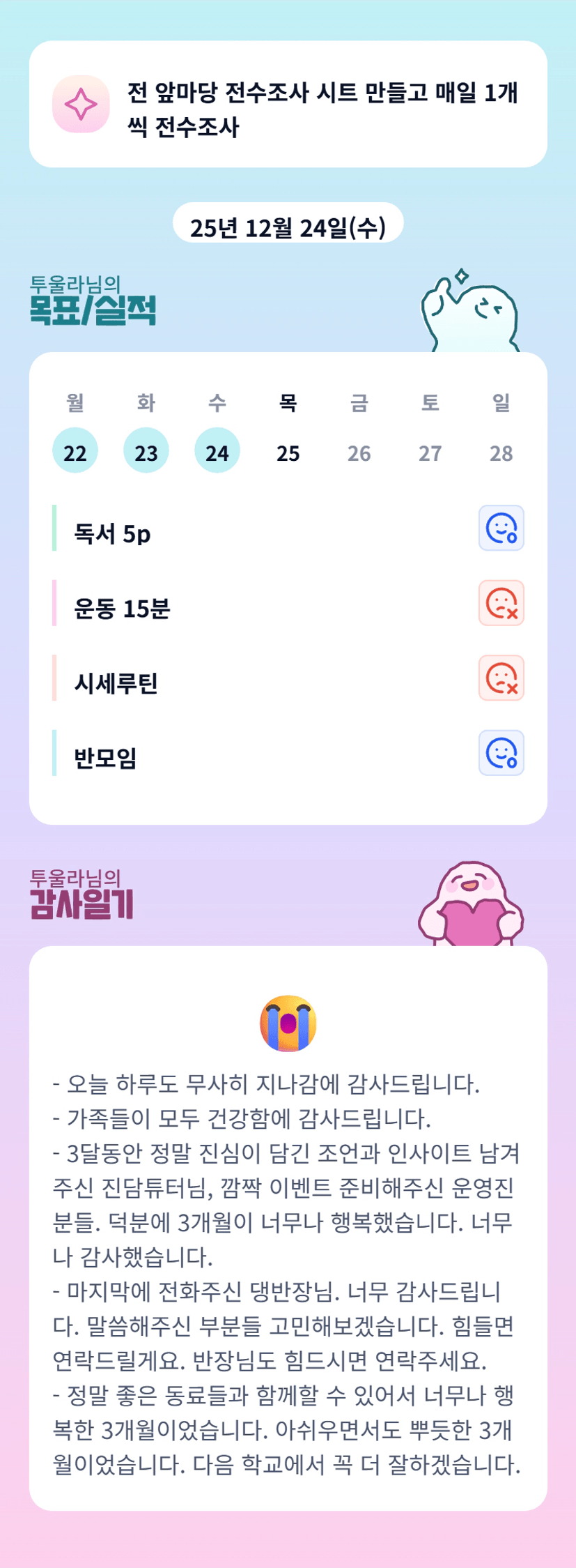 울라님 진짜 그릿이 뭔지 3개월간 많이 배울 수 있었어요🤍 넘 고생하셨습니당~~~~