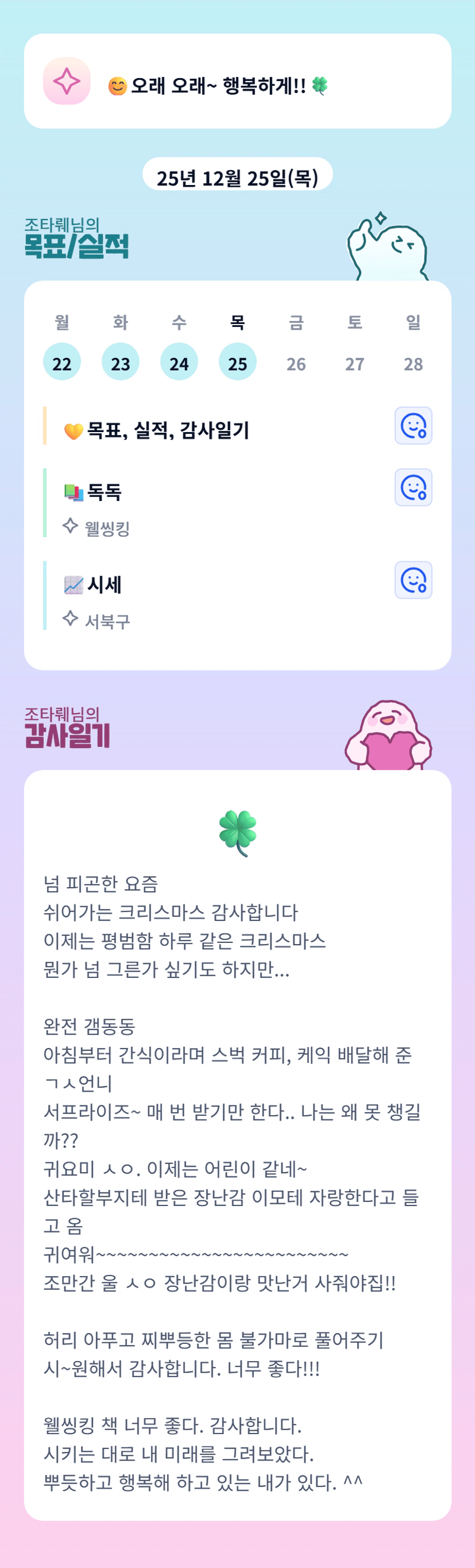 요즘 많이 피곤했을텐데 쉬어가는 클수마스 좋았네요 귀여운 조카들 애교에 조만간 조타님 쌈짓돈 또 털리겠네요ㅎ 웰씽킹~읽어도 읽을때마다 좋은책이죠👍