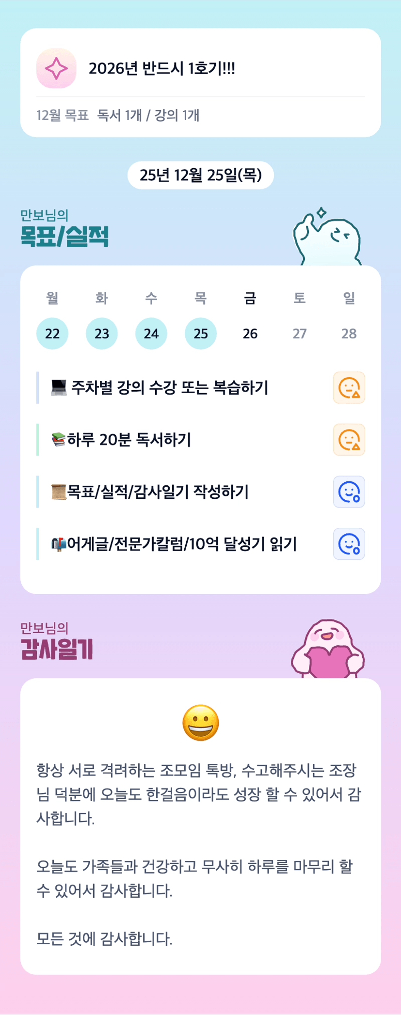 만보님~ 댓글 달러 놀러왔다가, 목실감 쭉~ 해내신 거 보고 감동 받고 갑니다^^ 다음주 교대근무로 밤에 일하실텐데요. 건강 잘 챙기시고요, 미리 마지막 조모임 오프 오실 수 없다고 말씀해주신 거 기억하고 있어요. 괜찮아요. 만보님, 하이브리드(오프+온라인)로 만나서 인사 잘 나눠요:)