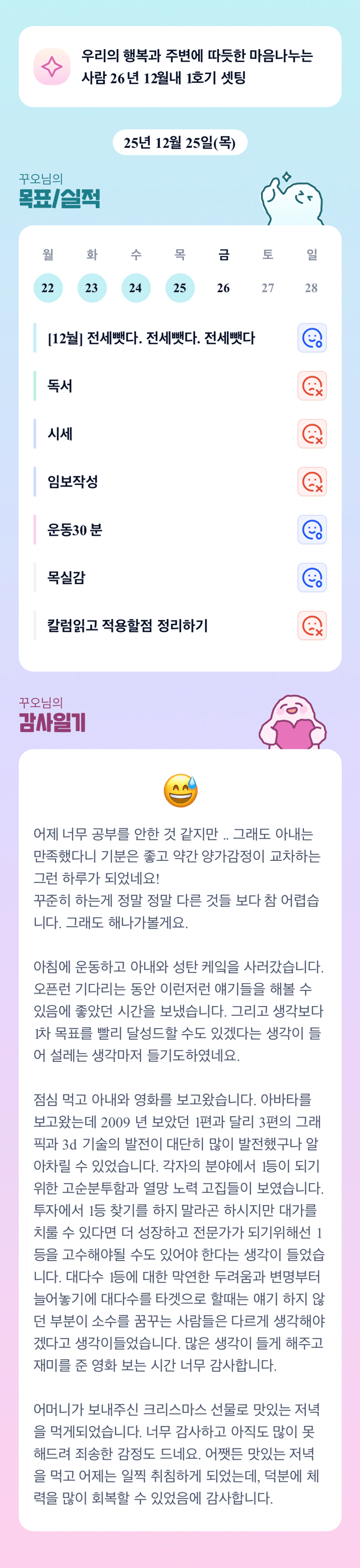 꾸준함 참 어렵죠 조장님,, 해나가면 할 수록 그게 가장 어려운 것 같습니다! 그래도 조장님 닉넴처럼 항상 꾸준하게 오래가는 투자자로 그리고 원씽처럼 행복과 따뜻한 마음을 주변에 나누는 사람으로 오래 오래 함께하길 간절히 응원합니다!! 조장님은 분명 잘해내실 수 있으실거에요~ 넘 좋은 선배님과 함께라 저 역시 너무 행복합니다~ 오늘 하루도 행복을 놓치지 말고 충실히 해야 할 일을 해나가는 꾸오님 항상 응원합니다!
