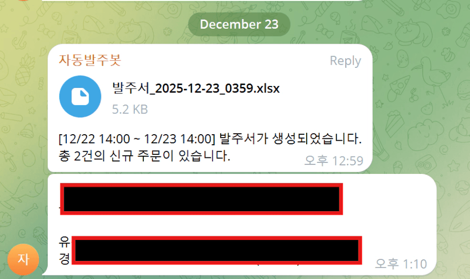 개발을 부업으로 공부해보면서 가장 나중에 만든게 제 쇼핑몰 자동발주 시스템입니다. 항상 외부에 있어도 오후 2시에는 멈춰서 카톡으로 하나하나 적어서 보내던 발주서들을 코드로 제작하여 서버에서 정해진 시간에 제게 텔레그램으로 보내줍니다.