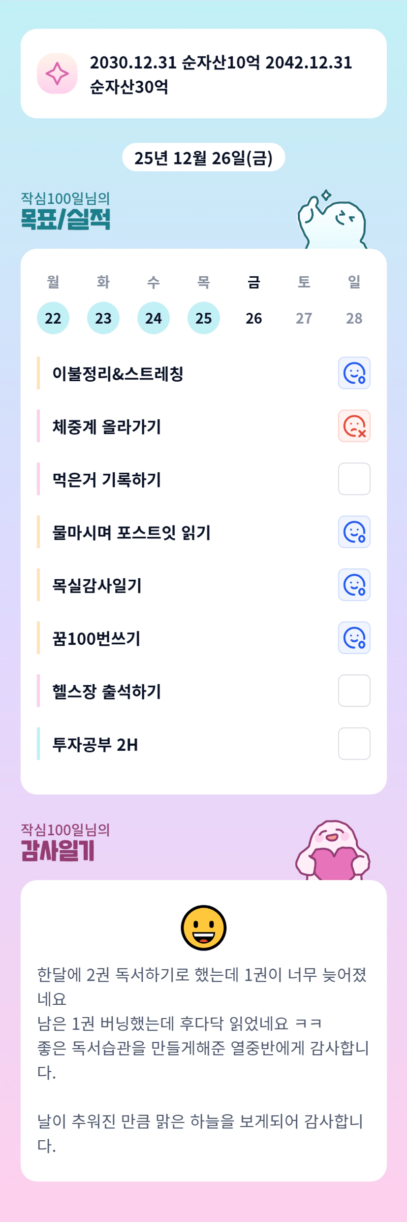 일어나서 이불정리 → 스트레칭 → 컴퓨터 앞에서 물 마시면서 꿈 포스트잇 읽기 → 꿈100번쓰기 → 목실감 → 운동