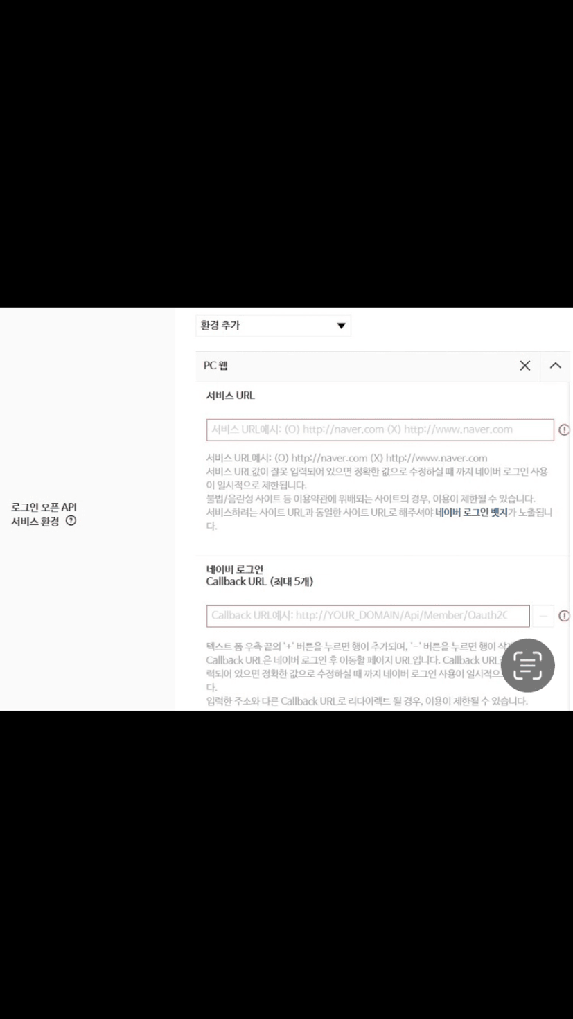 강의화면에서는 나오지 않았던 ‘로그인 오픈 API 서비스 환경’이 필수입력으로 나왔습니다. (화면 캡쳐본 유첨)