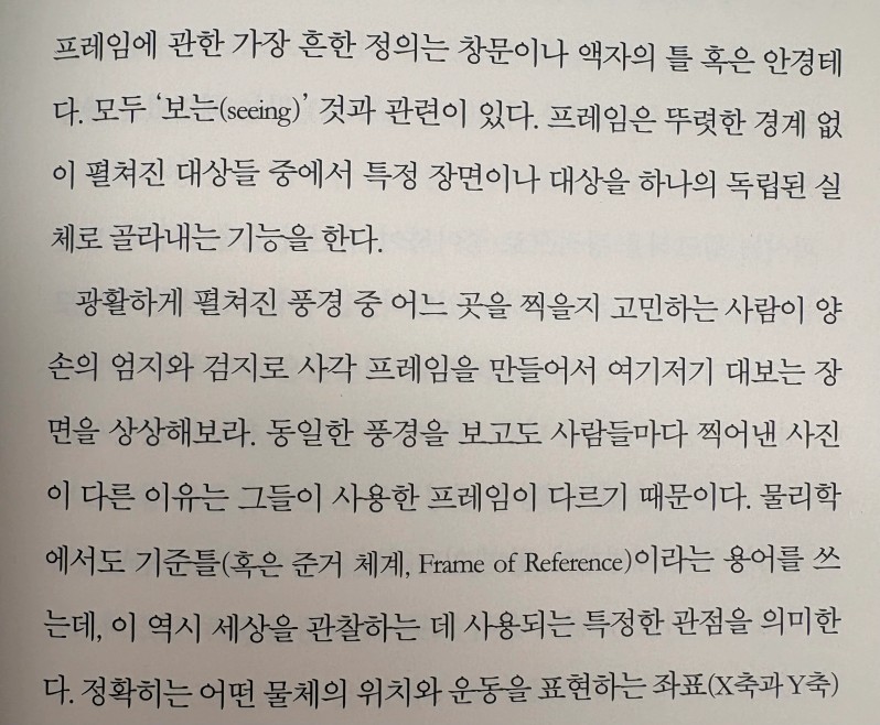 : 우리는 세상을 있는 그대로 보고 있다고 생각하지만 사실은 프레임을 통해서 채색되고 왜곡된 세상을 바라보고 있는 것이다. 드넓은 풍경을 손으로 만든 네모(프레임)로 본다면 어떤 사람은 나무가 보이고, 어떤 사람은 하늘을 보듯 _ 같더라도 어떤 프레임(손, 액자, 틀 등)으로 보는지에 따라 다르게 해석된다! (프레임의 중요성)
