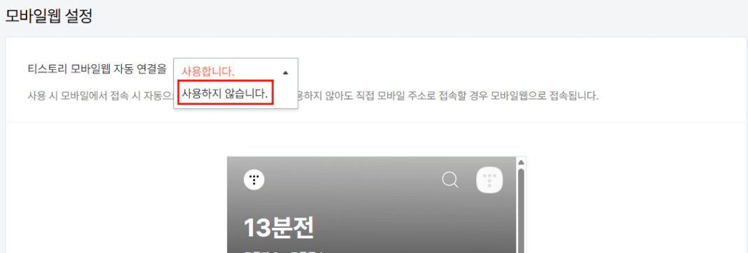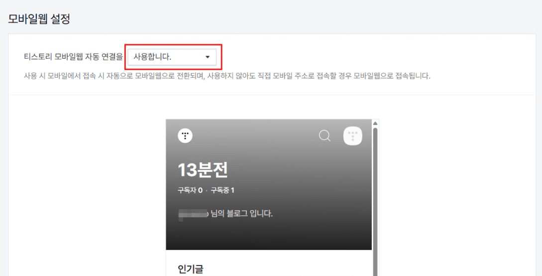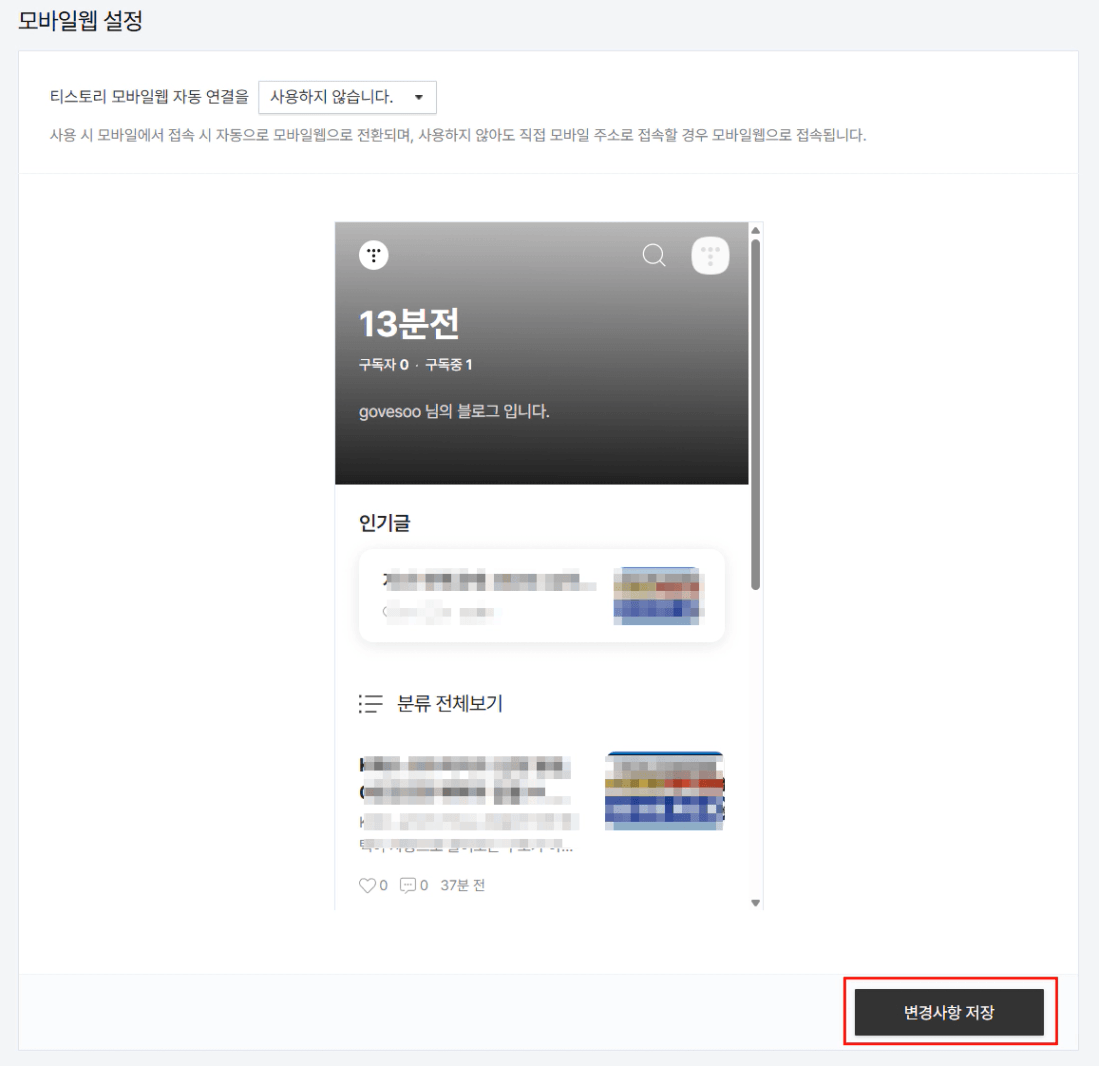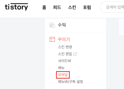 • 티스토리 관리자 페이지 > 사이드 메뉴 > 꾸미기 > ‘모바일’ 클릭