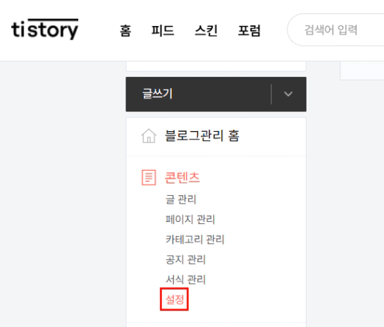 • 티스토리 관리자 페이지 > 왼쪽 사이드 메뉴 > 콘텐츠 > ‘설정’ 클릭