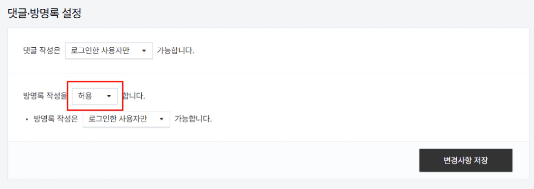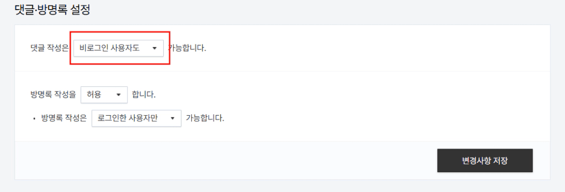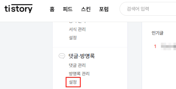 • 티스토리 관리자 페이지 > 사이드 메뉴 > 댓글·방명록 > 설정