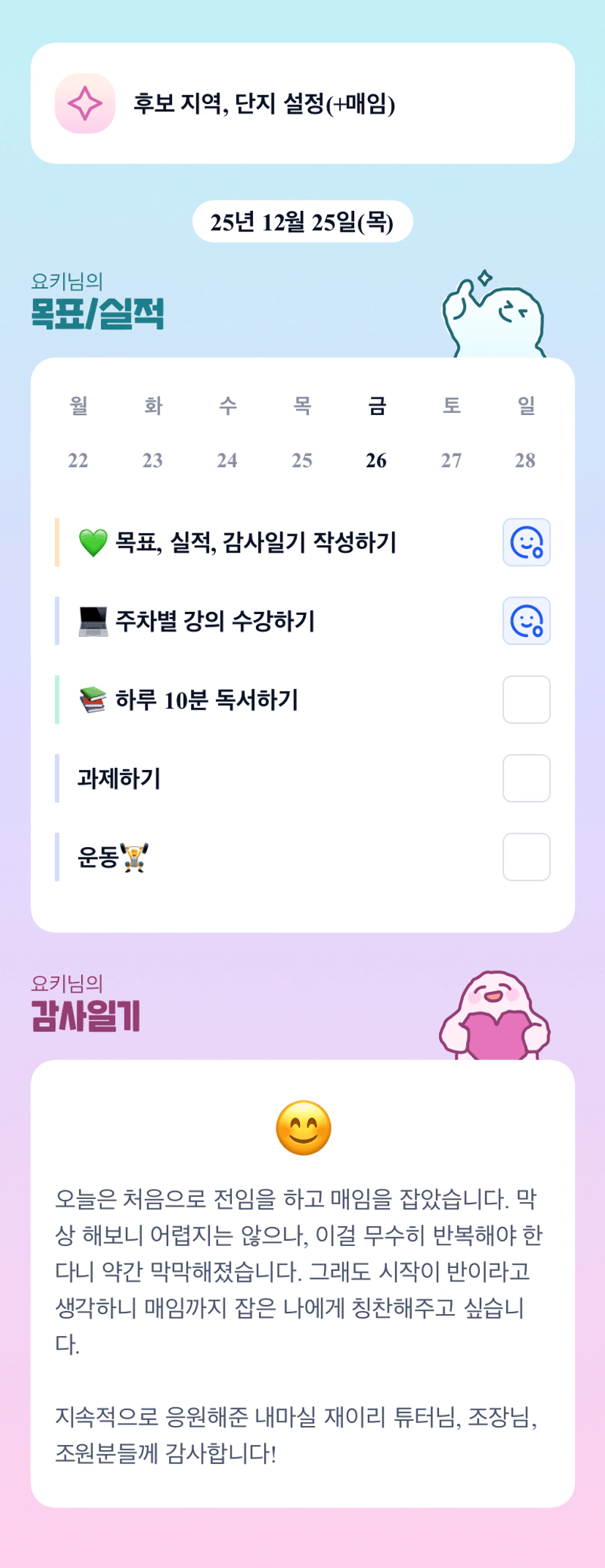 오오 첫 전임과 매임 축하해요ㅎㅎ 오늘 매임 가시는거겠죠? 요키님 잘 할수있다!!🔥