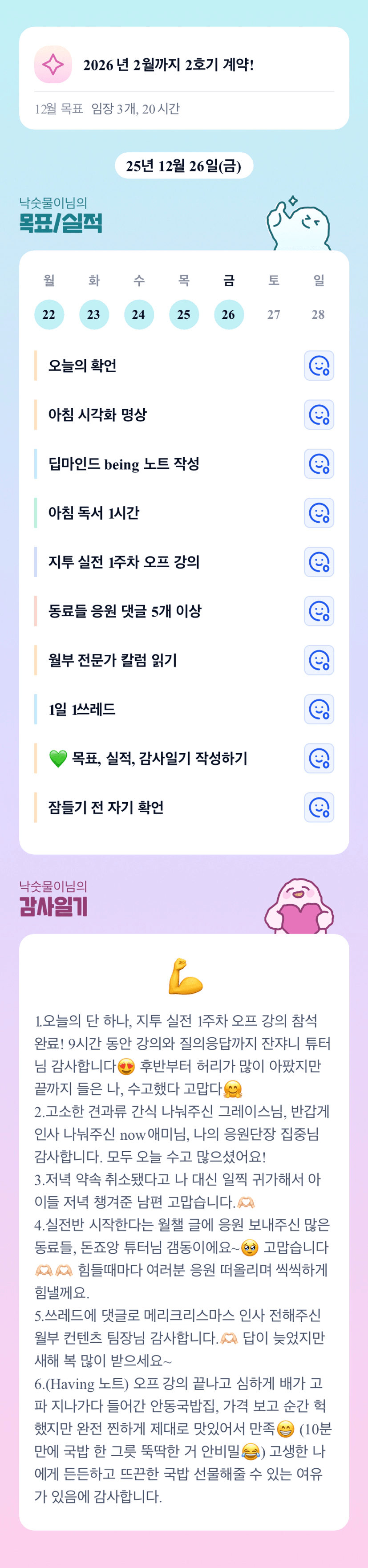 낙숫님 오늘 하루도 수고 많이 하셨습니다. 자주뵙게 되어서 전 너무 좋은데 ㅎㅎ 컨디션 관리 잘 하시면서 지투실도 화이팅 입니다^^