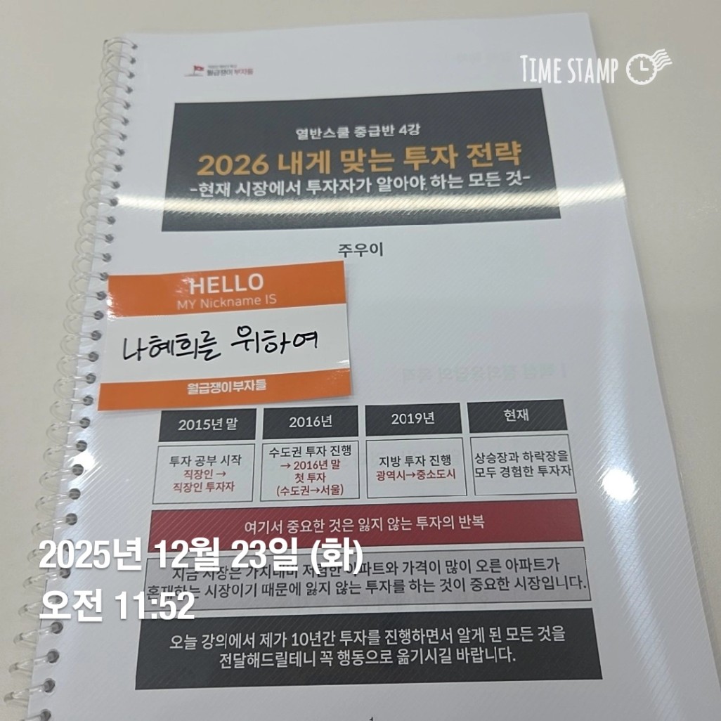 운 좋게 오프라인 강의에 초대되어 4강을 직접 다녀왔다. 아이들 픽업 시간 때문에 강의 끝까지 자리를 지키지 못해 아쉬웠지만, 직접 주우이님을 뵙고 앞으로의 투자 전략을 듣는 시간은 의미가 깊었다. 한 해를 마무리하는 12월에 나를 돌아보고, 다가올 2026년을 새로운 마음으로 다짐해 보는 소중한 기회였다.