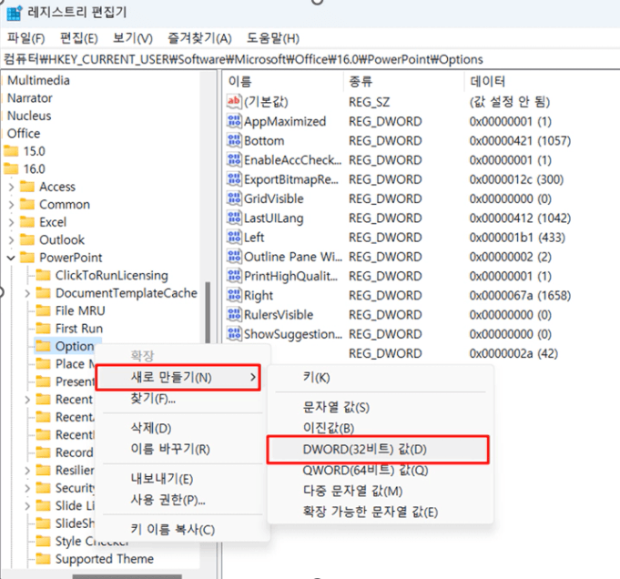우클릭 후 새로 만들기 > DWORD(32비트) 값 클릭