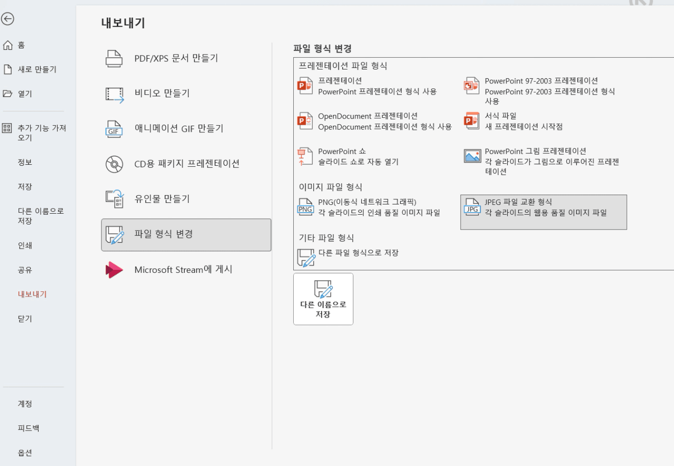 파워포인트 > 내보내기 > 파일형식변경 > JPEG 파일 교환 형식으로 저장해서