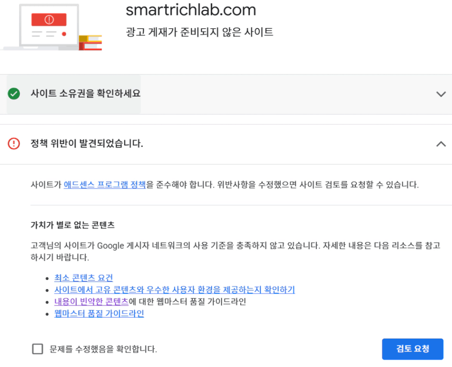 3. 가치가 없는 컨텐츠라는 말이 뜨면 보통 새 글을 3개 정도 더 쓰고 다시 승인요청하라고 안내하시던데