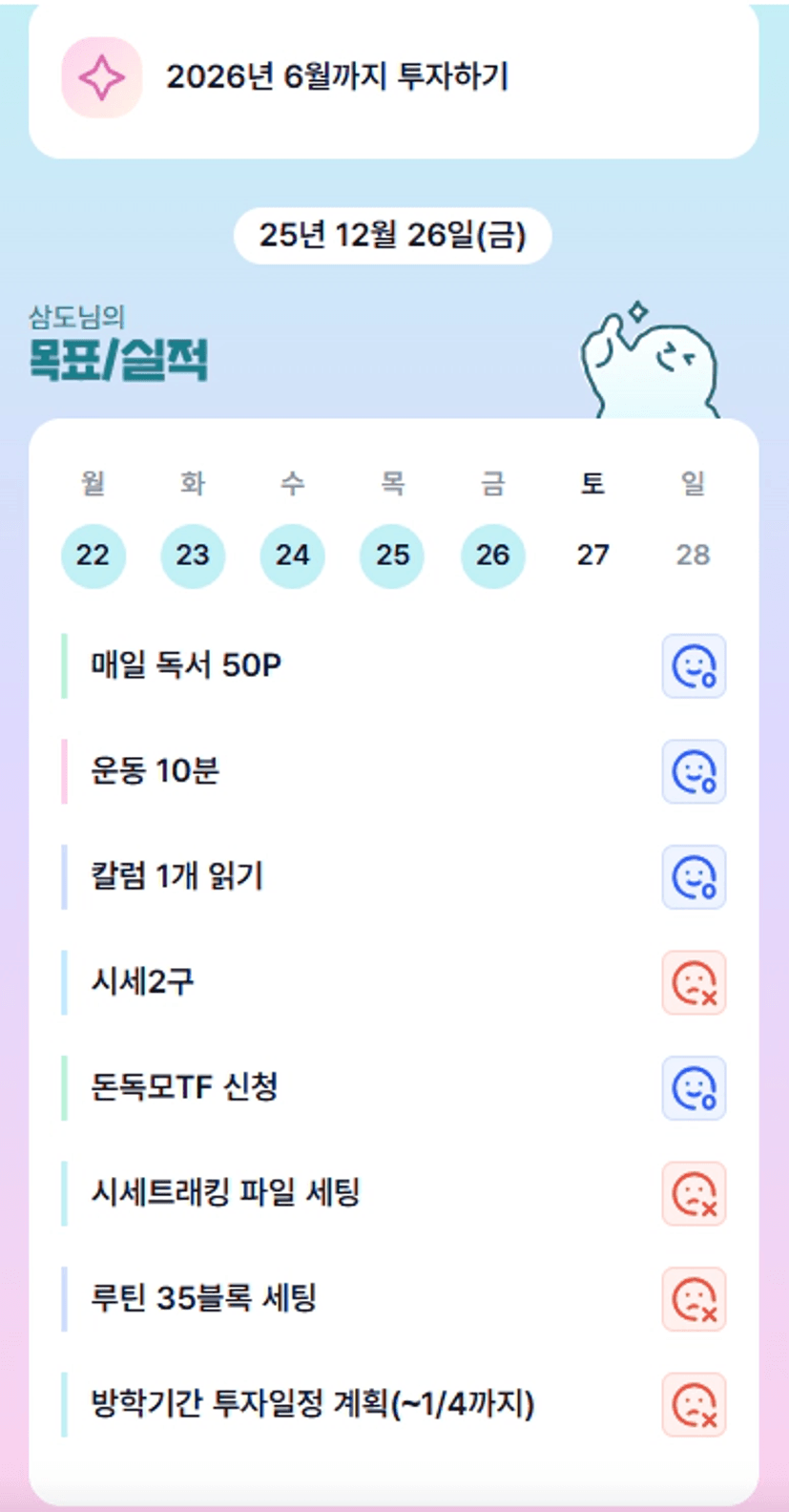 5. 키샤님과 통화하며 중꺾마 배울 수 있음에 감사합니다. 랄라님과 월학, 에이스반 이야기 나눌 수 있음에 감사합니다. 으뜸님과 통화하며 서로 노하우 공유하고 26년 일정 기디할 수 있음에 감사합니다. 조직조, 진대미들과 소통할 수 있었던 하루 감사합니다.