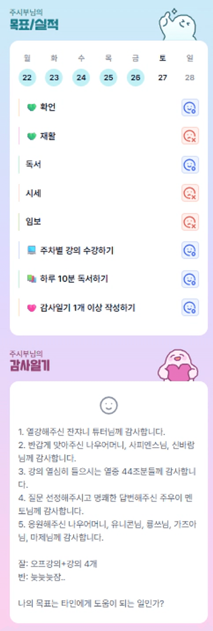 오프강의 잔쟈니 튜터님하고 너무 행복한 시간 보내셨을거 같아요!!! 멋지십니다!!^^ 26년 1월도 화이팅!!^^