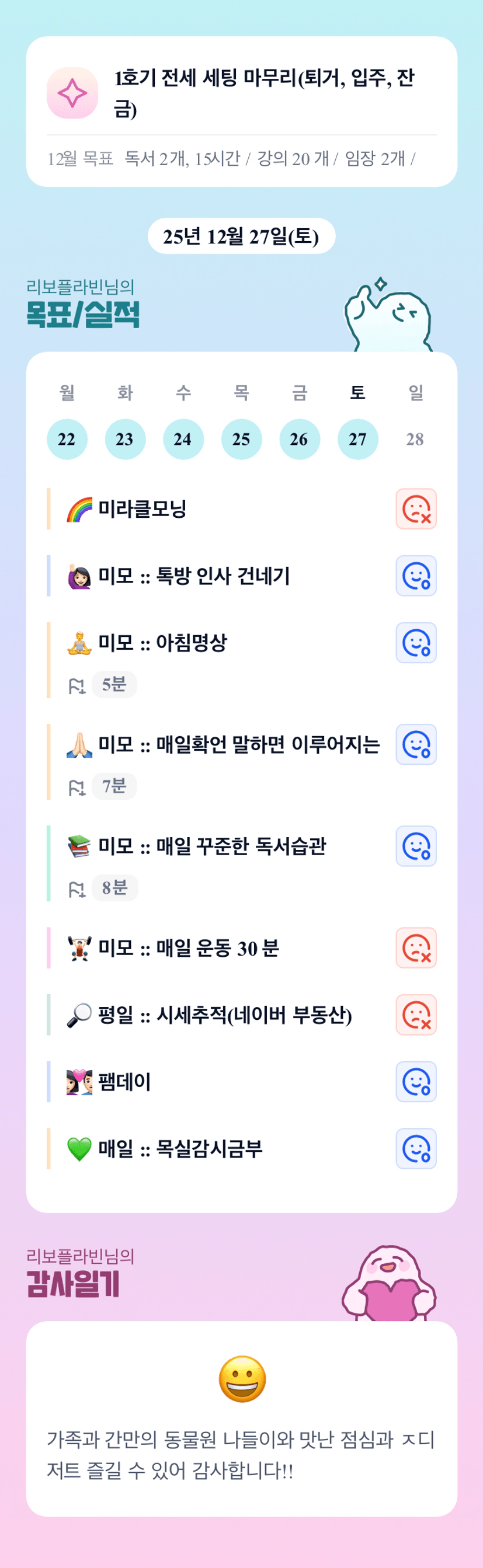 꾸준한 아침 루틴+가족과의 소중한 시간까지 올해 마지막 토요일을 알차게 보내시느라 고생많으셨어요~😀💖