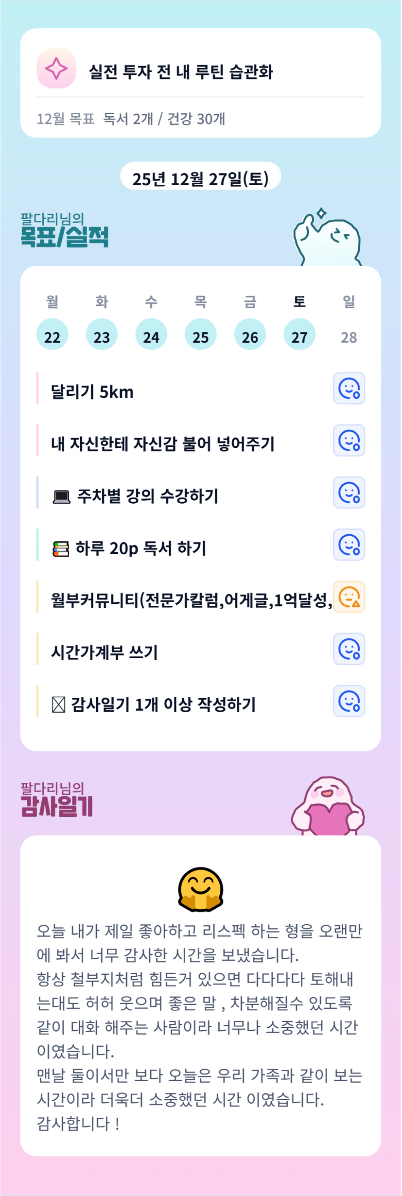 다리님 한달간 고생많으셨어요~ 탁월한 수용능력과 적용점 캐치 ㅎㅎ 투자까지 앞으로도 잘 해내실것 같아요 ^^ 자주뵈요~