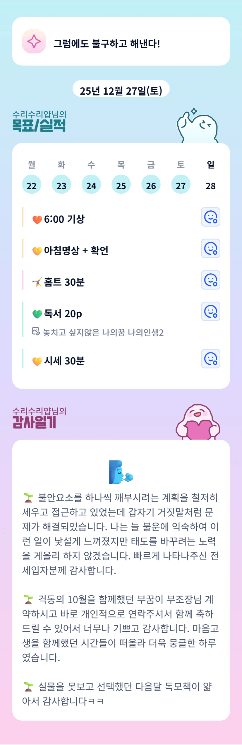 수리님~~~~ 걱정하신 문제가 잘 해결되었나봐요❣️ 그 순간에 엄청나게 힘들고 고민하던 문제들도 시간이 지나며 해결되는 순간이 많더라구요 다 잘 될거예요 화이팅💖
