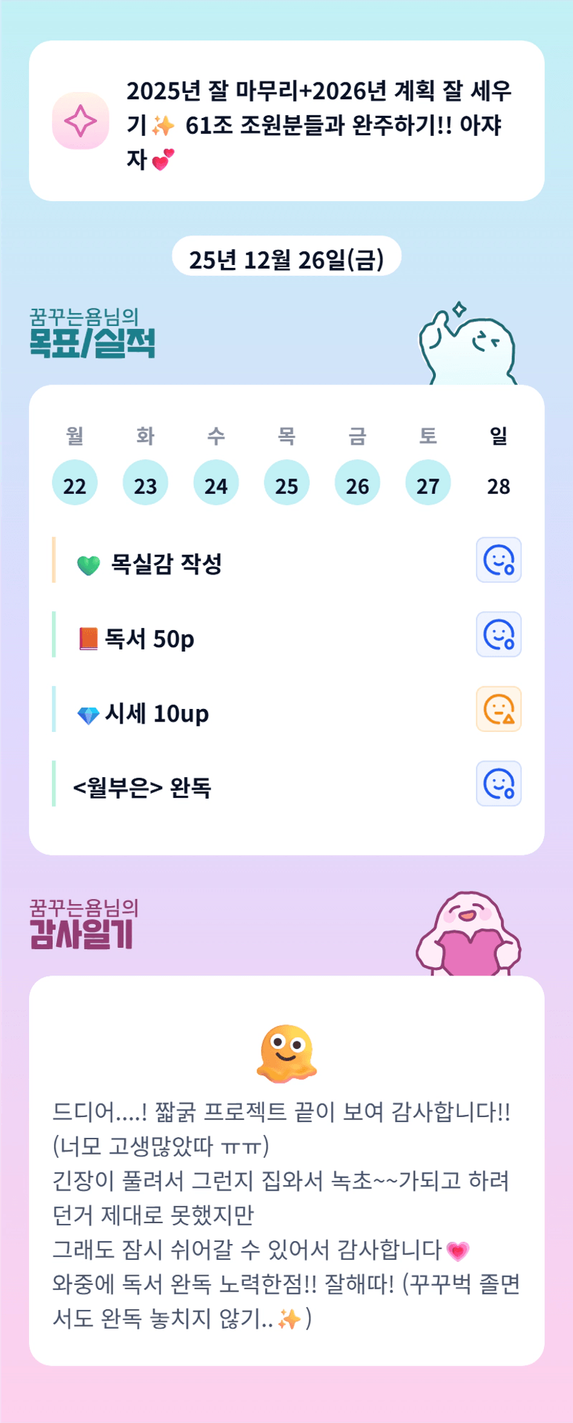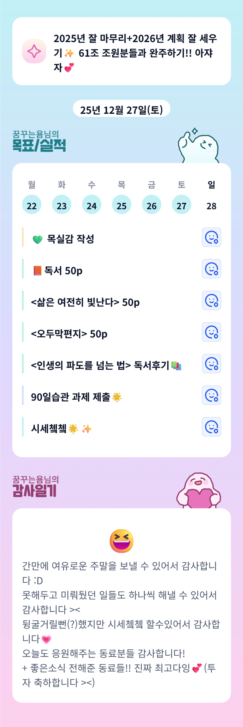 욤조장님 바쁜 일 끝나셨나요? 축하해요🩷 책을 동시에 몇 권 읽으시는 거예요? ㄷㄷ 멋져용👍🏻