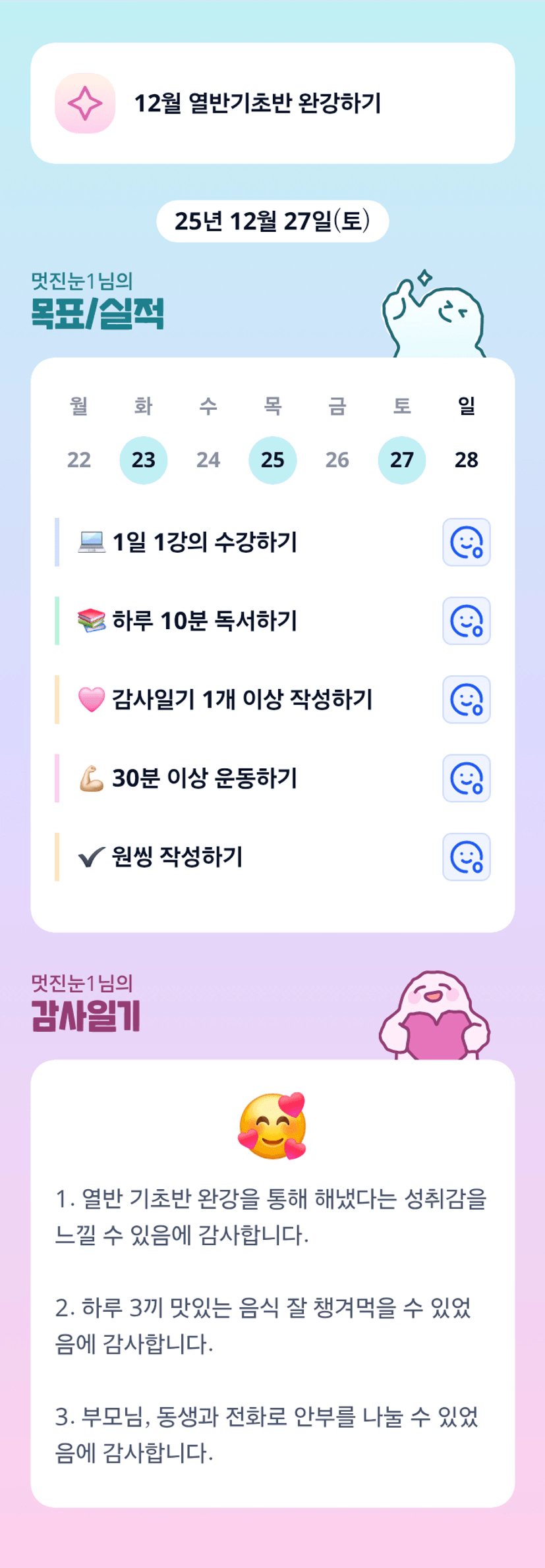 멋진눈님 목표 모두 달성!! 멋져여👍 행복한 주말 보내세요🧡