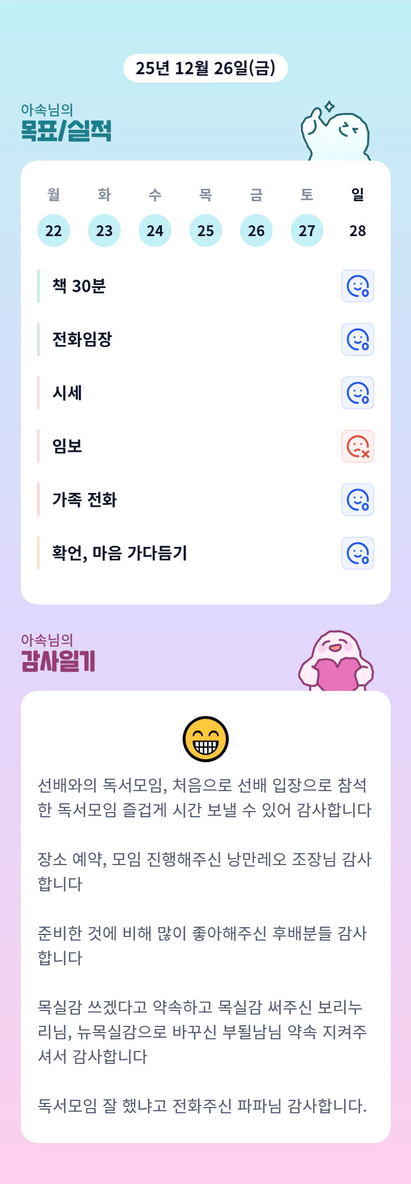 아속선배님 좋은말씀 많이 해주셔서 도움 많이 되었어요💕시간내주셔서 감사합니다!! 목실감 꾸준히 해보겠습니다 🫡