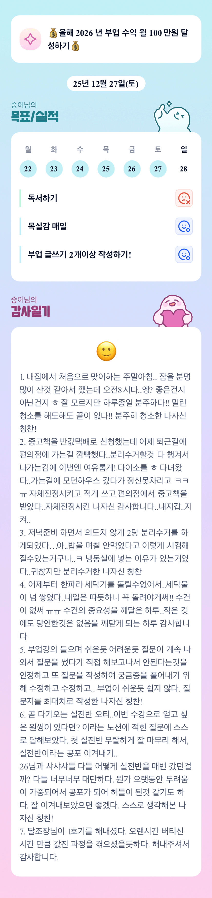 오늘의 원씽청소!!!!부업 완강 과제 완료1포3외 부업글쓰기 완료