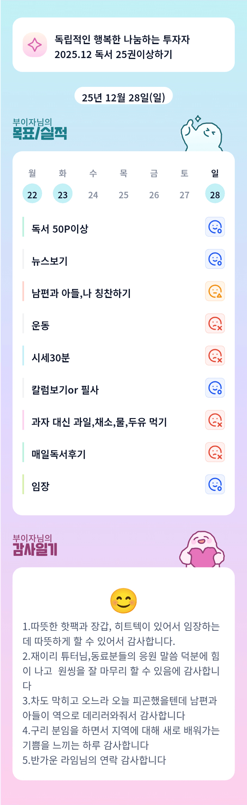 부이자님의 꾸준함 25년 너무 수고 하셨어요. 26년도 가족과 함께 행복한 한해 되시길 응원합니다^^