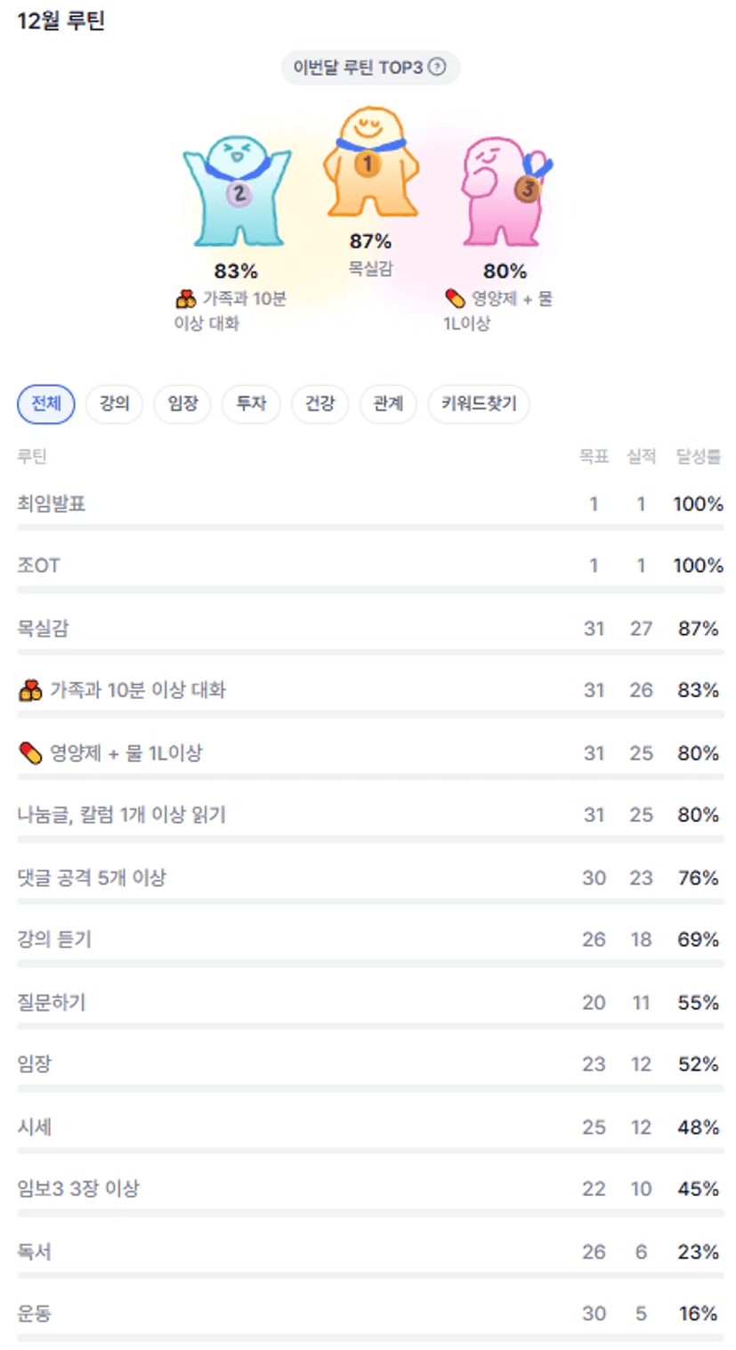 1️⃣ 목실감 - 통계 - 주간으로 들어가 이번주 나의 목실감 현황을 인증해주세요 ! :)