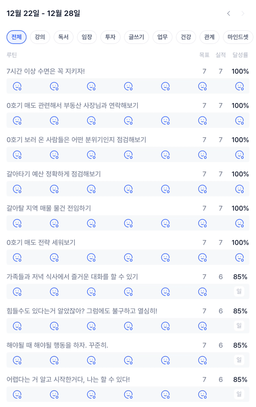 이번 주는 계획했던 것 만큼 부지런하지 못했다. 그래서 기대했던 것 만큼 결과에 가깝게 가지 못해서 스스로에게 실망을 한 주였다. 하지만 그나마 위안거리를 찾아본다면, 마음 가짐으로 제대로 가지는 것과 관련된 목표는 충분히 만족할만했다는 것이다. 실제적인 행동이 원했던 바에 미치지 못해서 아쉽긴 하지만 다음 주에 더 잘 해보고자 한다.
