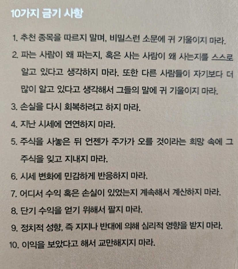 특히 인상 깊었던 것은 충분히 생각한 뒤 세운 전략을 여론이나 주변의 말에 흔들리지 말라는 조언이었습니다. 남들과 반대로 행동하는 것이 언제나 옳은 것은 아니지만, 모두가 같은 방향을 바라볼 때 오히려 위험이 커진다는 점에서 스스로의 판단 기준을 세우는 일이 얼마나 중요한지 깨닫게 되었습니다.