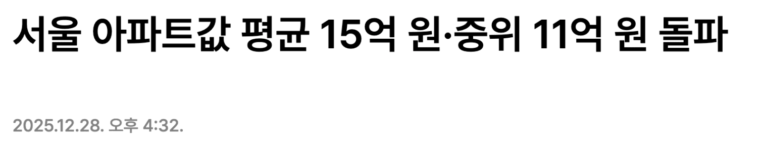 오늘 뉴스 기사에서 ‘서울 아파트값 평균 15억’ 이라는 타이틀이 눈에 띄었습니다.