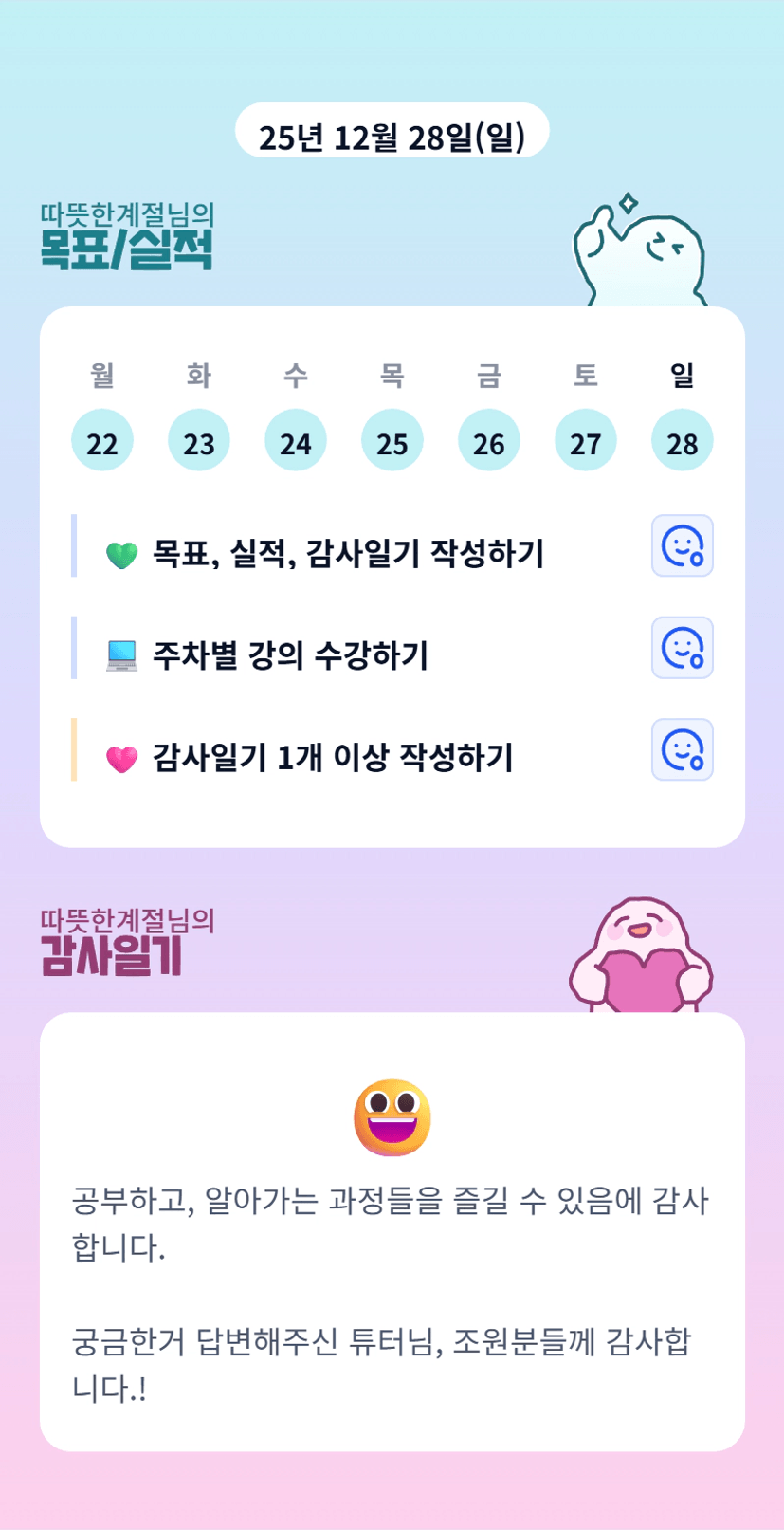 튜터님과 동료분들께 도움 많이 받으셔서 좋으시겠어요!! 하루하루 성장하는 계절님 멋집니다!!